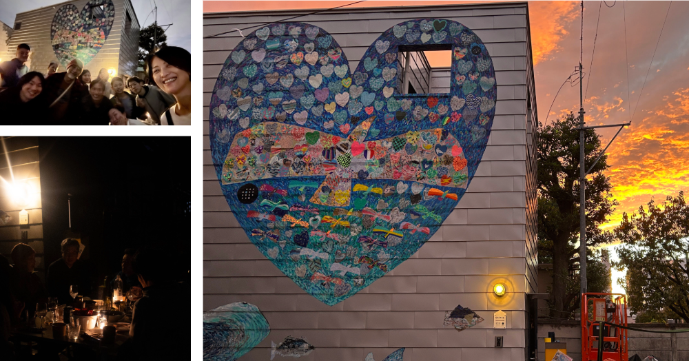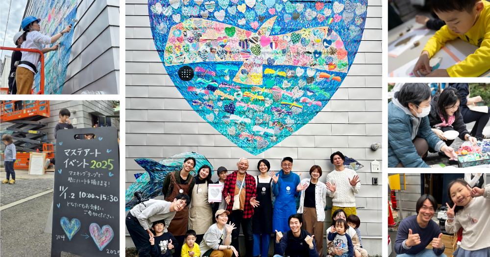 11月1日と2日、”たまに”の拠点の外壁に「巨大なハート」をみんなでつくるマステアートイベントを開催しました。記念すべき5回目となるこのイベントで、延べ約80名の手により、”たまに”の巨大なハートは、大空へ羽ばたく鳥たちとともに彩り豊かに生まれ変わりました。