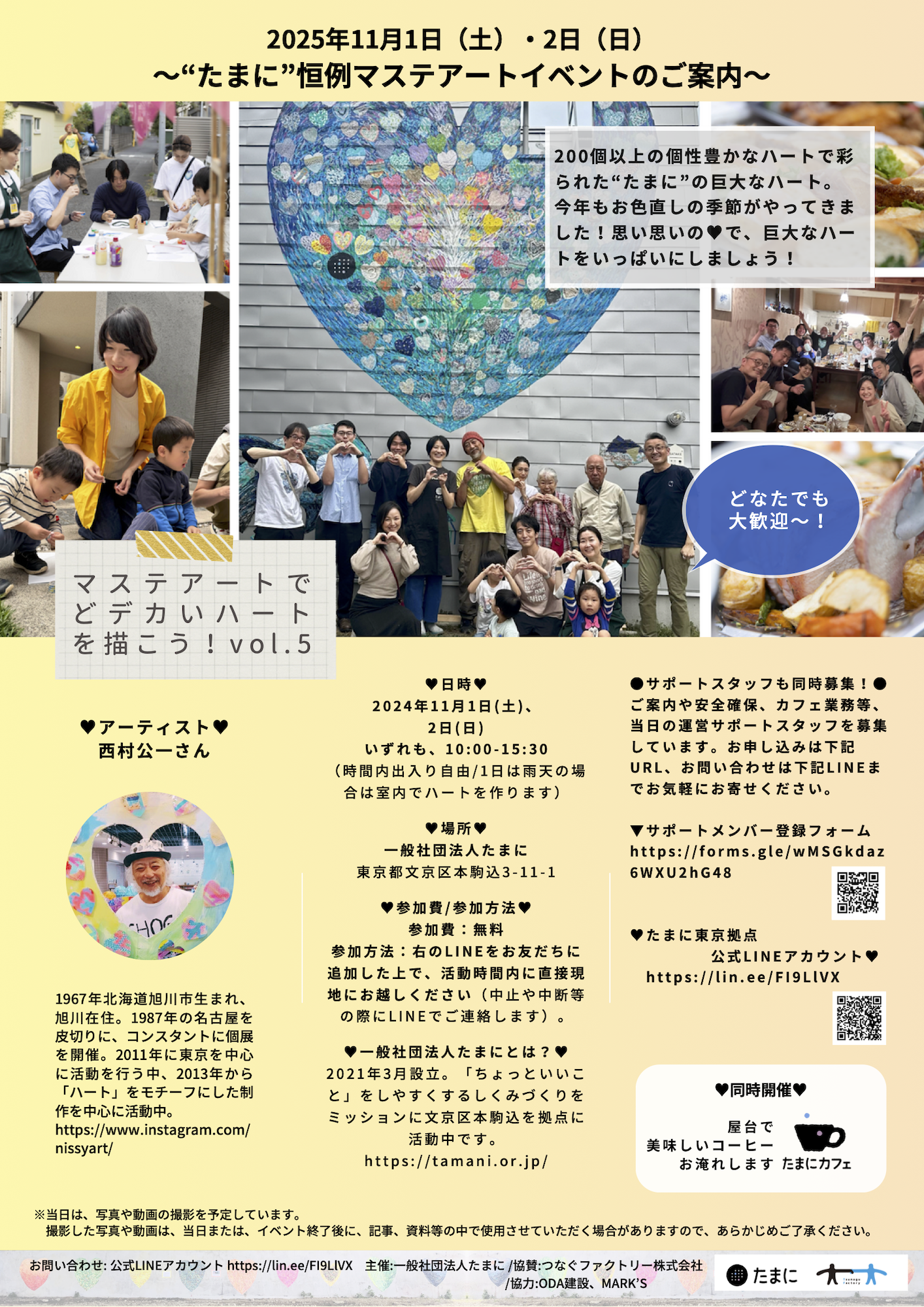 一般社団法人たまにでは、今年もアーティストの西村公一さんをお迎えして、東京拠点の外壁巨大ハートをリニューアルするイベントを開催します。